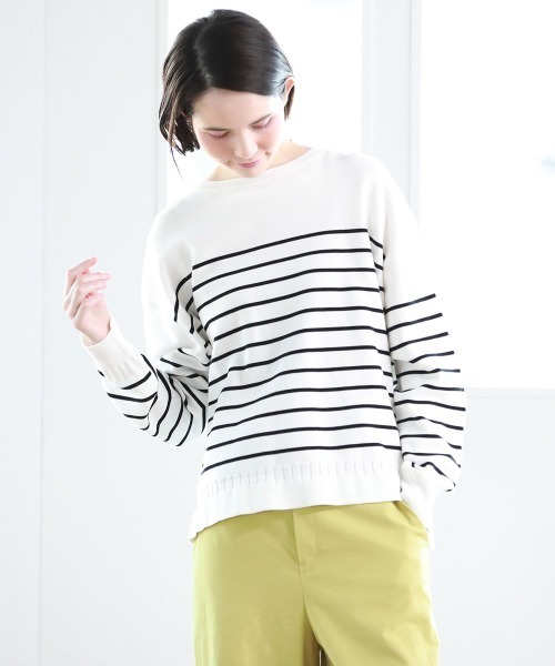 ミラノリブのほんのり表情感があるボーダーニット。裾や袖にワンポイントディテールを入れています。春らしいボーダートップスはマンネリしがちなスタイリングのワンポイントに。 【素材の特徴】 強撚コットンです。カジュアルになりすぎないようほんのり光沢のある面を選んでいます。ミラノリブですのでハリ感とほんのり表情感がポイントです。 【PAO DE LO VOYAGE】 少しトレンドを取り入れた遊びのあるデザインと気軽に着て頂ける分量感を抑えたシルエット,“航海“の,それ自体を楽しむように今を楽しむシリーズです。 ※画像の商品はサンプルとなりますので実際の商品と仕様、加工、サイズが若干異なる場合がございます。 ※お客様のモニター環境により実際のお色と多少異なる場合がございます。