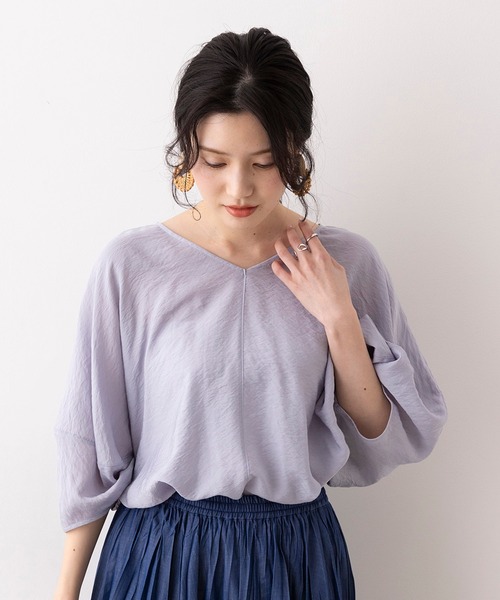 シアー素材+バルーンスリーブがトレンド感溢れるデザインブラウスふんわりとリラックスムード漂うブラウスは着るだけで女性らしさを出してくれます。袖のバルーンシルエットが柔らかな素材で膨らみ過ぎず◎長めの丈感も◎ネックはV明きで、抜け感を出しニュアンスカラーでもすっきりと見せてくれます。ふんわり素材はセンターで切り替えることで、シャープさもプラスさせてくれます。生地は透け過ぎない上品な光沢感のシアー素材です。エアフロー加工を施しているので、軽い着心地が魅力です。張り付き感もなくひんやりした肌ざわりので、暑い季節にも最適です。エアフロー加工…生地染色の際に、熱風を入れて機械を回すことで生地全体が膨らみ、 自然な自然な凸凹やシワの入った柔らかい生地へと仕上げております。 独特な風合いをお楽しみ下さい。カラーはオフホワイト、チャコール、ライトカーキ、グレイッシュブルーの4色展開です。ニュアンスカラーが今年らしく、合わせやすいカラーを選びました。▼おすすめコーデ▼優しいカラー展開のトップスですので、柄物のスカートや立体感のあるプリーツスカートなどがおすすめです。フェミニンな印象ですが、今年人気の柄パンツなどと合わせても◎足元は透け感のある素材に合わせ、大人なヒールがピッタリです!------------------------------伸縮性:なし生地の厚さ:★★☆☆☆透け感:あり裏地:なし------------------------------※お取り扱いについては、商品についている品質表示をご確認下さい。また、モニター・環境等で実際の商品と多少色が異なって表示される場合がございます。予めご了承下さい。◆商品のお気に入り登録◆完売カラーの再入荷通知を受け取ることができます。ぜひご登録下さい。◆ブランドのお気に入り登録◆新商品や再入荷など、ブランドのお得情報を受け取ることができます。ぜひご登録下さい。