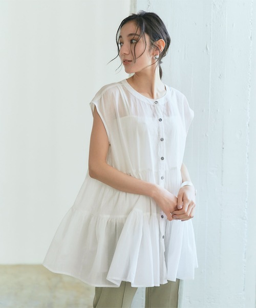 シアー感のあるコットンボイル素材を使用したフレンチスリーブブラウス。・ティアードデザインでフェミニンな印象をプラス。・二の腕が気になりにくいフレンチスリーブもポイント。・Aラインシルエットなのでスッキリとしたボトムスと好相性。・目を引く差し色を含んだオシャレなカラーバリエーションも魅力。・裾のギャザーフレアが女性らしいスタイリングを叶えます。・前釦開きで着用しやすく、夏にぴったりな万能ブラウスです。※当商品は機械による生産の過程上、どうしても"生地を織る際の糸の継ぎ目"や多少の"ほつれ"、他繊維の"混紡"、また、形やサイズや柄に多少の"誤差"が生じる場合がございます。※サイズは、実寸サイズを測っているため多少誤差がでる場合があります。製造工程の関係上、各採寸箇所実寸(平置き)より【約-3cm~+3cm】程度は誤差の許容範囲とさせて頂いておりますので、予めご了承くださいませ。※メーカーより密封状態で入庫し、検品時に再度袋詰めを行っておりますが、素材により染料等の臭いが強い場合がございます。※発送上の状態によって商品がシワになる場合がございます。※商品により色落ち・色移りがある場合がございますので、品質表示をご確認の上、お取り扱いにご注意くださいませ。【生地】ガーゼ調の薄手生地【伸縮性】なし【透け感】あり【裏地】なし