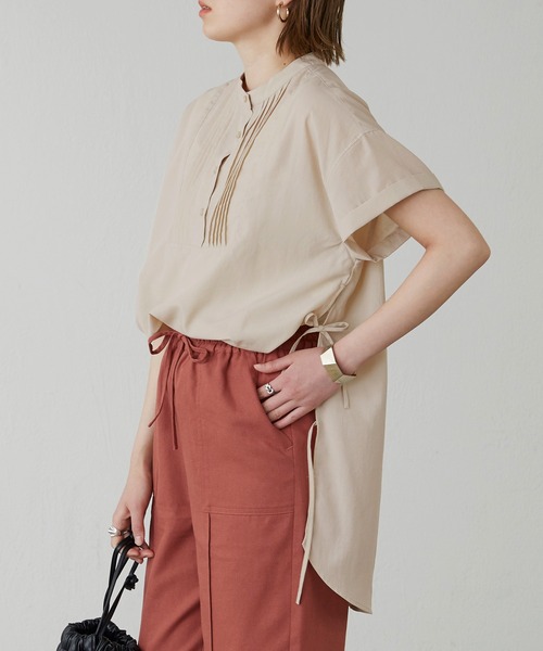 シアー素材のデザインシャツチュニックで旬顔コーデに ■デザイン 艶やかな素材感が魅力のスパンブロードを使用したシャツチュニック。 身体のラインを拾わないゆったりとしたシルエットでありつつ、ノーカラーで洗練された雰囲気を演出。 やや透け感のあるシアー素材でこなれた印象を与えてくれます。 インナー次第で自分らしいコーディネートが叶うのもシアーシャツの特徴です。 拘りのデザインにより、1枚ですっきりとこなれたスタイリングに。 胸元部分にボザムといわれる切り替えを施し、さらにピンタック仕様を取り入れました。 また、サイドには深めのスリットを入れアクセントのリボンを。 クラシカルなムードの中に抜け感を取り入れ、BONLECILLらしい仕上がりで完成。 チュニック丈に加えスリット入りのラウンドへムなので体型カバーも叶います。 定番のオフホワイト・ベージュ・ブラックに夏らしいイエローを加えた4色展開でご用意いたしました。 ■スタイリング テーパードパンツやカラーパンツなどを合わせるとバランスの取れたコーディネートに。 また、プリーツスカートなどを合わせてこなれ感のある女性らしい着こなしもおすすめです。 シアー感のある生地を使用しているので、インナーにはキャミソールやタンクトップを合わせると◎ 流行りのビスチェやベストと合わせてレイヤードスタイルもお楽しみいただける、着回し力抜群のアイテムです。 ■POINT ・スタンドカラーで洗練された印象に ・身頃に施したピンタックでクラシカルさをプラス ・フレンチ袖で落ち感を演出 ・リボン付きサイドスリット入り ・お尻が隠れる着丈 ・ラウンドヘム×チュニック丈で体系カバー ※屋外での撮影画像は、光の当たり具合で色味が違って見える場合がございます。 また、ご覧になっているデバイスやモニター環境によって、実際の色味と多少異なって見える場合がございますので予めご了承をお願い致します。 ≪お買い物をお楽しみいただくために≫ ▼商品のお気に入り登録 完売カラーの再入荷通知や、ラスト1点の通知、セールの通知も受け取ることができます。 ▼ブランドのお気に入り登録 新商品や再入荷等、いち早くブランドのお得な情報を受け取ることができます。 ※取り扱いについては、商品についている品質表示でご確認ください。