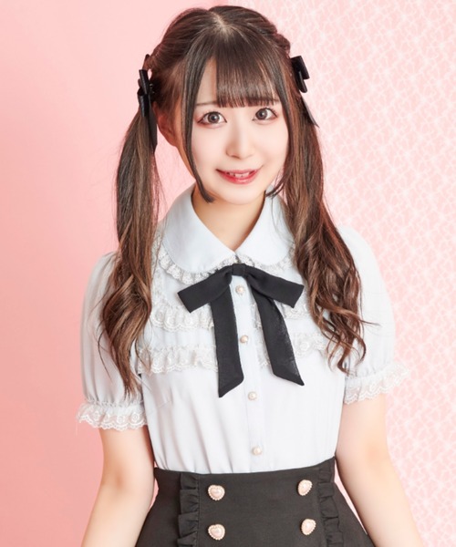 お花のレースがふんだんにあしらわれたブラウス。胸元の配色のシフォンリボンは取り外し可能です♪金縁のパールボタンを合わせて上品なアクセントをプラスしました☆
