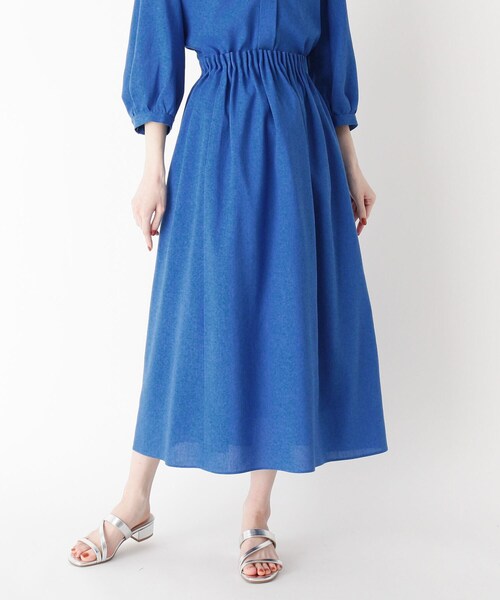 【デザイン】たっぷりのギャザーでキュッと引き締めたゴムウエストと、ふんわりシルエットのコントラストが美しいフレアスカート。幅広いトップスと合わせやすい無地デザインなので重宝すること間違いなしです。同素材のブラウスと合わせたセットアップスタイルで旬度をグッとアップさせて。【生地感】細番手のリネンとポリエステルを混紡した、薄くて軽いストレッチ素材。こちらの商品はセットアップでご利用いただけます。ブラウス:検索番号543-82057こちらの商品は主に夏に着用いただける商品です。モデル情報:身長165cm B70 W55 H83 着用サイズ:40(M/ミセス)店舗へのお問い合わせ商品番号:543-72004●製品寸法:40(M/ミセス):W66cm 総丈86cm42(L/ミセス):W69cm 総丈87cm備考: