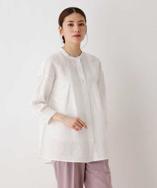 【デザイン】 さらっとしたタッチで風合いよい高質なフレンチリネン100%素材を使用したリネンシャツ。 身体がおよぐシルエットでリラックスした雰囲気が漂い、すっきりみえるバンドカラーの前あき仕様なので羽織にも最適。 胸元のタックでシルエットを出し、良質感漂う雰囲気にしています。 【生地感】 通気性が良くて着心地のよい、初夏から盛夏に向けて最適なフレンチリネン100%。 ※こちらのアイテムはやや透け感があるため、インナーの着用をおすすめします。 【サイズ】 大きいサイズ(LL以上)展開あり。※04(LL)サイズはWEB限定サイズです。 モデル情報:身長166cm B78 W58 H82 着用サイズ:02(M) 店舗へのお問い合わせ商品番号:316-82008 ●製品寸法: 02(M):着丈71cm B110cm 袖丈35cm 肩幅55cm 03(L):着丈73cm B118cm 袖丈36cm 肩幅57cm 04(LL):着丈75cm B126cm 袖丈37cm 肩幅60cm 備考: