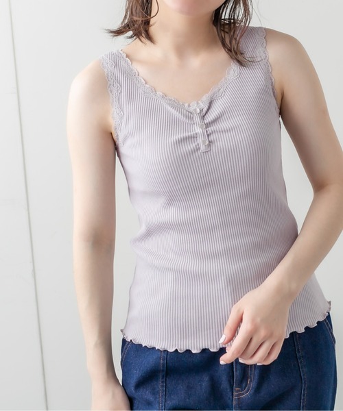 ほんのり甘さが香るリブタンク 1枚着としてはもちろん、インナーとしても幅広く着用できるヘンリーネックタンクトップ ・レースとリブカットソー生地がシンプルでもこなれ感のあるガーリースタイリングに華やかさを叶えます。 ・胸元のボタンとギャザー仕様がアクセントに。 ・程よくタイトなシルエットで女性らしい印象を与えてくれる1枚。 ・ヘンリーネックなので1枚でも着用しやすくなっています。 ・レース仕様なのでフェミニンさもプラス。 ■スタイリング ・シャツのインナーとして色違いで揃えるのもおすすめです! ・トレンドのシアーシャツとの相性抜群! レイヤード に重宝するレースタンクトップ 。裾のメロウを見せると可愛い雰囲気に。もちろんインしてスッキリと着るのもおすすめです。フロントのスナップボタンを開けてアレンジもできます。 ----------------------------- リブ生地 裏地:なし 光沢感:なし 透け感:淡色に多少あり 伸縮性:あり 生地の厚さ:薄手 ----------------------------- ※ご覧のモニター環境や撮影環境により実際の商品と多少色味が異なって見える場合がございます。 ご理解の程よろしくお願いいたします。