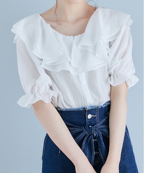 ヒロイン級にコーデが華やかに!!ダブルフロントで着れるラッフル衿のブラウスが登場♫ カジュアルにもフェミニンにも着れるおすすめのブラウス。 ■デザイン ・程よいシアー感でこれからの時期の着回しに大活躍。 ・ラッフル衿が女性らしさ溢れるアイテムです。 ・ボタンのあるデザインと、衿だけの両面着れるデザインでお作りしました。 ・キャンディスリーブで袖口までこだわりが詰まっています。 ・ホワイト(無地)、オフホワイト(花柄)、アイボリー(花柄)、の3色展開。 ・爽やかさと合わせやすさばっちりのベーシックカラーです。 ■スタイリング ・おすすめのスタイリングはデニム合わせ。 ・可愛らしい雰囲気のブラウスも、パンツと合わせることでカジュアルさをプラスできます。 ・ミニスカートやロングスカートと合わせて、フェミニンコーデも楽しめます。 ・厚底サンダルや、スポサンなど足元で雰囲気を変えられます。 ----------------------------- 裏地:なし 光沢感:なし 透け感:あり 伸縮性:なし 生地の厚さ:薄手 ----------------------------- model:165cm 着用サイズ:FREE ※ご覧のモニター環境や撮影環境により実際の商品と多少色味が異なって見える場合がございます。 ご理解の程よろしくお願いいたします。 ウエストゴム有りです。