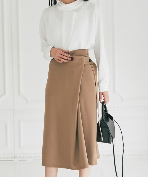 Cookie Chocolate(クッキーチョコレート) ラップ風デザインがカジュアルモードな 雰囲気にしてくれるスカート。 ボタンでウエストの調整ができ デザイン性が高いラップ風スカートです。