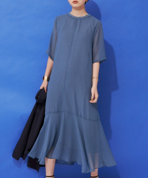【女性らしさ溢れるフレアヘムが上品な印象に】 フレアラインのシルエットが女性らしさをグッと引き立てるワンピース。 POINT ・1枚でサマになる裾フレアシルエット ・ラインを拾いにくいディティールで体型カバーも期待 ・春夏のムード漂うシアーアイテム ジョーゼット特有の柔らかい風合いが女性らしいオーラを纏って、一枚で着映える一押しの一着。 リラクシングな雰囲気でお召頂けるシアー素材は肌あたりの優しいストレスフリーな着心地を実現。 プレーンなクルーネックが清楚な印象を与え、前中心には切り替えとステッチを施し、 シンプルながらデザイン性のある一枚に仕上げました。 STYLING 1枚着るだけでサマになる主役級ワンピース。 ジョーゼット特有の柔らかい風合いが女性らしさを演出しています。 ミュールや華奢ストラップのサンダルでキレイ目なスタイリングはもちろん、 スニーカーでカジュアルに崩して」着るスタイリングもおすすめ。 やや長めの袖丈が安心してお召しいただけるデザインになっています。 ------------------------ 透け感/あり 光沢感/ややあり 伸縮性/なし 裏 地/あり 厚 み/薄手 ------------------------ ※詳しいお手入れ方法は商品タグをご参照ください。 【商品のお気に入り登録】 完売カラーの再入荷通知やラスト1点の通知 プライスダウンの通知も受け取ることができます。 ぜひご登録ください◎ 【ブランドのお気に入り登録】 新商品や再入荷など、 ブランドの情報をいち早くお知らせします! ぜひご登録ください◎ ※ご注意※ ・屋外の光や照明の当たり具合で、実際の商品の色味と カラー別画像の色味に若干の違いが発生する場合がございます。 ・詳細画像と併せてご確認の上、ご注文いただきますようお願い致します。