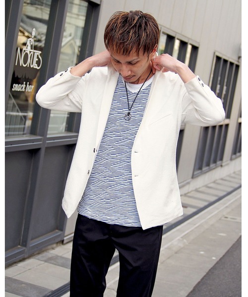 無地ライクなジャカード織りでテンションのあるストレッチ素材。国内でも数台しかない特殊な織機で作っています。一見カモフラ柄の様にも見えるムラ柄調のジャカード織りで、タテ・ヨコに良く伸び、ナイロンの上品な光沢とツルっとした肌触り、接触冷感の機能もあります。イタリアンカラーをベースにした袖七分丈のデザインジャケットです。衿は折り返してラペル状にしても着用でき、一重仕立てで軽く仕上げていますのでシャツ感覚、カーディガン感覚で羽織って下さい。同素材のパンツも展開していますのでセットアップのきれいめコーディネートでストレスフリーな着心地を楽しんで下さい。同素材パンツ=「イージーパンツ」(品番:1264-5108)※画像の商品はサンプルです。実際の商品とは仕様・加工・サイズ・素材が若干異なる場合がございます。※屋外での撮影画像は、光の当たり具合で色味が違って見える場合があります。商品の色味は、スタジオ撮影の画像をご参照ください。
