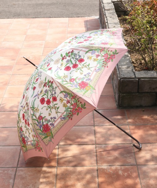 【アイテム説明】華やかなスカーフ柄が描かれた長傘です。スリムで持ち運びもしやすくスタイリッシュ。雨の日にも華やかな柄の傘の柄で気持ちも上向きに◎