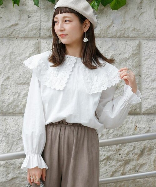 大きな襟が目を惹くブラウス。 トレンド感のあるレースカラーが大人フェミニンな印象にしてくれます。 キャンディースリーブで女性らしさをプラス。 トップスとしてのメイン使いはもちろん、 スウェットとのレイヤードスタイルもおすすめです。 袖口のフリル部分はゴム仕様でブラウジングも可能です。 バックボタン付きで着脱しやすいのも嬉しいポイント。 肌触りの良いコットン100%。 軽い着心地で、今の季節に活躍の1枚です。 - - - - - - - - - - - - - - - - - - - - - - - - - - - - - - - - - 透け感:ややあり 裏地:なし 伸縮性:なし 光沢感:なし - - - - - - - - - - - - - - - - - - - - - - - - - - - - - - - - -