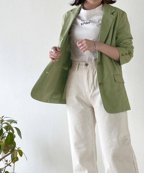 さらりとナチュラルな風合いが快適なテーラードジャケット。 スッキリとしたスタンダードなシルエットとフィット感に加え 洗練されたディティールで、この春一押しの一着です。 @ p o i n t ・袖口の飾りボタンでおしゃれ度UP ・リネンとコットンをバランスよくブレンドし、薄手で軽い素材を使用。 ・肩パット無し ・ポケット付き ・裏地無しの為季節の変わり目に重宝する優秀アイテムです◎ ●厚み/薄手 ●透け感/なし ●伸縮性/なし ●裏地/なし <色移り・色落ちについてのご注意点> この商品は摩擦(特に湿った状態での摩擦)や汗や雨などでぬれた時は他の衣料や下着に色が移る事がありますので、十分ご注意ください。 また洗濯の際に移染する場合もございますので、他の物とは分けて洗う事をお勧めします。 <お洗濯時のご注意点> ・濃色は洗濯の際、他の物と一緒に洗わないでください。 ・ぬれた状態で他の洗濯物と一緒に重ね合わせないで下さい。 ・漂白剤及び漂白剤入りの洗剤のご使用はお避け下さい。 <お届け時のシワにつきまして> ページで着用している商品は撮影前に全てプレスをかけております。 その為お送りする商品は畳みジワや細かいシワがついている場合がございます。 ご了承下さいませ。 ●アイロンは裏側から低温プレス ● ボタン部分アイロン禁止 ●しわになり易い性質があります。濃色は摩擦、汗等で色が移る場合があります。着用中の摩擦や洗浄等で毛羽立ち、濃色は白くなることがあります。素材表面を傷つけないために裏返して洗浄して下さい。雨や水等に濡れるとしみのような跡が残ることがあります。しみや汚れが付着した場合は早めにクリーニング店にご相談下さい。 ●退色を防ぐため光の当たらない場所で保管して下さい。 ●着用中の摩擦や洗浄等により毛羽立ちやピリング(毛玉)が発生することがあります。 毛羽立ちやピリングが発生した場合は、ブラシ、毛玉取り器、ハサミ等を状況に合わせて使いわけ早めに丁寧に取り除いて下さい。着用の際はバッグやその他のかたいもの等との摩擦にご注意下さい。風合いを損なわないためにも連続着用はおさけ下さい。 ●先の尖ったものやざらついたものに引っ掛けた場合、糸が飛び出すことがあります。アクセサリー、ベルト、バッグ等には十分ご注意下さい。 取り扱いの際は取り扱い絵表示確認の上充分注意して下さい。