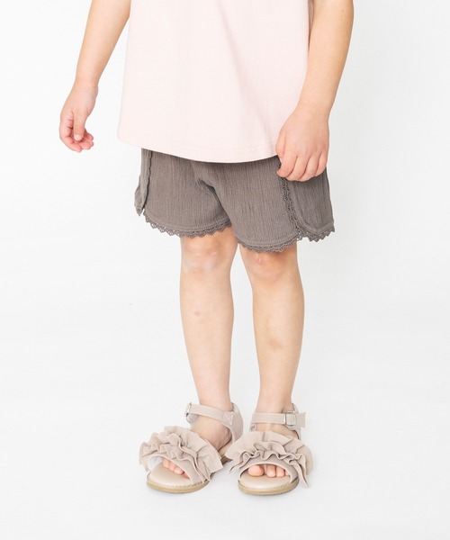 独特の縦畝の表面感が特徴的な楊柳素材を使用したショートパンツです。柔らかいカットソー素材ですので、動きやすく穿き心地も良くキッズにおすすめです。同色のレース&タッセルコード使いがポイントです。