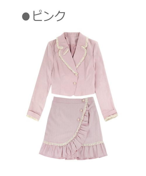 ほど良くキラキラ度あるシルバーのストライブ柄 ロマンチックなディテールに加えてフォーマル感も演出 華やかパールボタン+ヴィンテージレース より一層クラシカル&フレンチな雰囲気に ショート丈ジャケットはキリっとした印象 スカートは内側スカパンの安心仕様 フェイクラップデザインでフェミニン感UP 春らしい「ピンク」と「白」の2色展開 同じデザインの「黒無地」タイプも販売中だよ