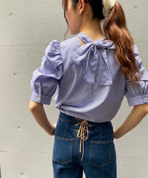 2021 春アイテム シンプルなフロントにバックの大きなリボンが映えるブラウス。ふんわりとしたパワーショルダーでトレンド要素をプラスしています。プチハイネックが顔周りをすっきり見せてくれるのも◎。高めのバスト位置に入れたギャザーから広がるシルエットがガーリーな雰囲気です。シンプルな無地はもちろん、コーディネイトのアクセントになってくれるチェック柄などもラインナップ。・5分袖