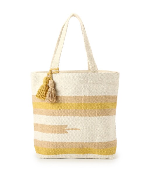 【デザイン】 ラグなどにも使用するしっかりしたインド綿混紡素材を丁寧に手織りした、味のある生地の縦長トートバック。 アクセントカラーを効かせたボーダー柄が、装いに爽やかなムードを呼び込みます。 A4ファイルなどもすっぽりと収まる大きめサイズで、荷物をガシガシ入れて頂けます。 本体の柄のカラーに合わせたボリューミーなタッセル付き。 ※ポケット数:内側×1 店舗へのお問い合わせ商品番号:C70-02311 ●製品寸法: 00:高さ34cm 幅(上部)39cm 幅(下部)39cm マチ11cm 持ち手上がり24cm 付属チャーム全長14cm 幅4cm 備考:重量:約485g
