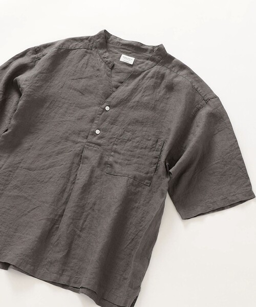 【素材特性】 60番手の繊細なオーガニックリネンを使用したプルオーバーバンドカラーシャツ。 オーガニックリネンというとガサッとした肌触りが特徴というイメージがあるかもしれませんが、今回使用しているは細番手で高級感があり、肌触りも抜群なこだわりの素材です。 【デザイン】 通常のバンドカラーではなくVネックに切れ込みが入ったヘンリーネックに近い衿を採用。 前立て下辺りからタックを取ったデザインでゆとりのあるフィット感の身幅にしました。 【スタイリング】 シンプルなデザインと使いやすいカラー展開なのでどんなシーンにも◎ 太目のパンツを合わせて、全体的にリラックスしたシルエットで仕上げるのもオススメです! ---------------------------- 裏地:無 光沢感:無 生地の厚み:普通 伸縮性:無 透け感:無 水洗い:可能 ---------------------------- ホワイト model::H177 着用サイズ::LARGE グレー・ネイビー model::H180 着用サイズ::LARGE ※画像の商品はサンプルです。 実際の商品と仕様、加工、サイズが若干異なる場合がございます。 予めご了承下さい。