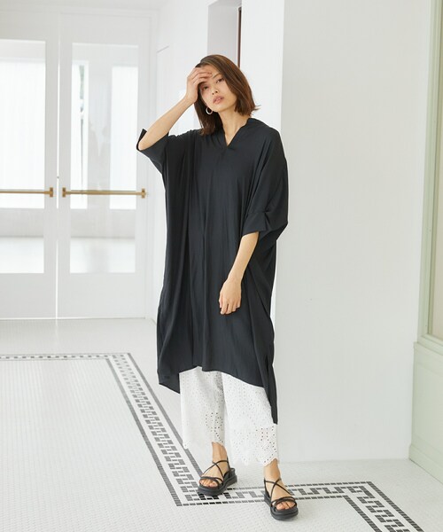 トレンド感のあるワイドスリーブがポイントのロングシャツワンピース。 サイドにスリットを入れ裾をアシメにすることで動きが出やすくなります。 デニムやパンツとのコーディネートもおすすめ。 生地を贅沢にたっぷりと使用しボリュームを出した、立体感のあるシルエットで着映えします。 首元のホックを留めてもきちんと感のある着こなしが出来ます。 【商品取り扱い上のご注意】 ■手洗い可能。 ■ネットを使用してお洗い下さい。 ■軽く押し洗いして下さい。 ■静止型乾燥機のご使用をおすすめします。 ■あて布使用。 ■この商品は糸及び編組織の性質上、引っかけ・引っ掛かりやすい性質をもっています。着用の際は十分ご注意ください。 ■アイロンはあて布をしてかけてください。 ■この商品は摩擦(特に濡れた状態での摩擦)や、汗や雨などで濡れた時は他の衣料や下着に色移りする場合がありますので、十分ご注意ください。 サイズ:肩幅:38.5cm 裾巾:91.5cm 着丈:104cm 素材:ポリエステル:100% 原産国:中国製