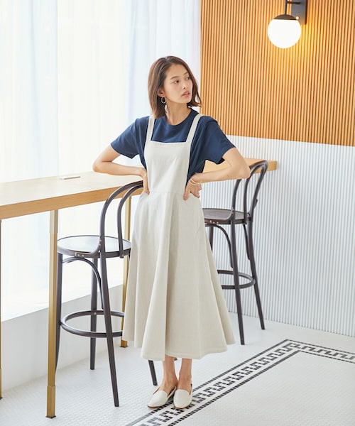 トレンド感を纏うワンピース。 サロペットデザインのワンピースは、ハイウエストでスタイルアップを実現。 レイヤードアイテムによって雰囲気の変化が楽しめる1枚は、フラットサンダルやスニーカーなど、様々なシューズと好相性です。 ナチュラルな風合いが魅力のリネン混生地を使用しました。 ボタンのアジャスターで長さの調節が可能です。 【商品取り扱い上のご注意】 ■石油系溶剤による弱いドライクリーニングができます。 ■アイロンはあて布をしてかけて下さい。 ■この製品は、デリケートな生地を使用しておりますので、性質上、糸引きや滑脱が起こりやすいので、着用、着脱時、アクセサリー等に引っかかりやすいので、十分に注意してください。 サイズ:ヒップ:116cm ウエスト:83cm 肩紐:69.5cm 着丈:80cm 素材:麻:55% 綿:45% 【裏地部分】ポリエステル:100% 原産国:中国製