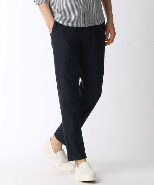 同素材スタンドジャケット(品番:1264-3503)のセットアップパンツ。無地ライクなジャカード織りでテンションのあるストレッチ素材。国内でも数台しかない特殊な織機で作っています。一見カモフラ柄の様にも見えるムラ柄調のジャカード織りで、タテ・ヨコに良く伸び、ナイロンの上品な光沢とツルっとした肌触り、接触冷感の機能もあります。後ベルト側に平ゴムを入れ、前から見た時にスラックス風に見えるイージーパンツデザイン。テーパードシルエットの綺麗なラインで、別布もストレッチ裏地を採用する事で伸縮性を活かしたストレスフリーな穿き心地です。カラー09ホワイトには膝裏を付けて透け感を減少する様にしています。※画像の商品はサンプルです。実際の商品とは仕様・加工・サイズ・素材が若干異なる場合がございます。※屋外での撮影画像は、光の当たり具合で色味が違って見える場合があります。商品の色味は、スタジオ撮影の画像をご参照ください。