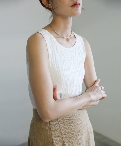 -point- & -styling- さらりとした手触りのリブニットタンクトップ 大きめのウェーブが女性らしいニュアンスをプラスしてくれます。 スタンダードに手に入れたいアイボリーと、鮮やかなカラーのブルー、パープル、グリーンの4色展開でご用意。 1枚で着ても、ジャケットやシャツのインナーにもおすすめ◎ インナーレイヤードラウンドネックトップス ---------------------------- 素材 レーヨン63%・ナイロン37% ---------------------------- 伸縮性 ★★☆☆☆ 裏地 なし ---------------------------- ※モニター・環境等により実際の商品と多少色味が異なって表示される場合がございます。 予めご了承をお願いいたします。 【お買いものをお楽しみいただく為に!】 ▼商品のお気に入り登録 完売カラーの再入荷通知や、ラスト1点の通知、セールの通知も受け取ることができます。 ▼ブランドのお気に入り登録 新商品や再入荷など、いち早くブランドのお得な情報を受け取ることができます!
