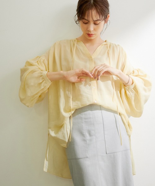 【素材】 ヴィスコースラミーの超極細の繊細な糸を使用し、ヘルシーさとツヤ・上質さが合わさった素材を使用。 【デザイン・シルエット】 スタンドカラーのスキッパーネック、ボリュームのあるリラックスしたデザイン。大胆なボリュームスリーブ は、クラス感を出すためにタックを細かくとり、繊細なステッチを施しています。 リラックスしているけど、どこか上質さ、クラス感を感じさせるこの夏にはヘビロテするブラウスです。 【カラー】 爽やかな白、バターイエローとヘルシーなモカの3色展開。 【おすすめのスタイリング】 デニム~スラックス、スリムフレアーなどのパンツ合わせがオススメ。 スカートはハイウエストタイトスカートかフレアロングスカートなどすこしノンシャランなバランス感がオススメです。 ---------------------------- 透け感:あり 裏地:なし 伸縮性:なし 光沢感:少しあり 生地の厚さ:薄手 ポケット:なし ポケット数:なし 洗濯方法:洗濯機可 ---------------------------- 【モデル情報】 モデル身長:167cm 着用サイズ:38 詳細画像着用モデル身長:165cm 着用サイズ:38 ※画像の商品はサンプルです。 実際の商品と仕様、加工、サイズが若干異なる場合がございます。 ※室外で撮影している画像は、光の影響で色味が若干異なって見える場合がございます。 ※商品の入荷状況は、店舗までお問い合わせをお願いいたします。 店舗での商品のお取り扱いについて ROPE'の商品は、ROPE'実店舗のみの取り扱いになります。