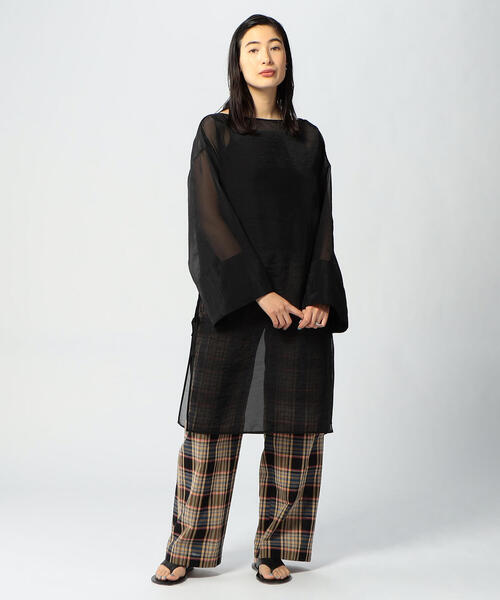 強撚でドライタッチな表面感のある合繊素材のチュニックブラウスです。ミリタリーサージカルガウンのデザインをモダナイズし、袖のボリューム感やシャープな衿ぐりに仕上げています。Tシャツやタンクトップなどインナーでレイヤードスタイリングを楽しめる、シンプルになりがちな夏のスタイリングにプラスしていただけるアクセサリー感覚のブラウスです。2021SS商品店舗にお問い合わせの際は、下記の商品番号をお申し付けください。商品番号:34-01-12-01002