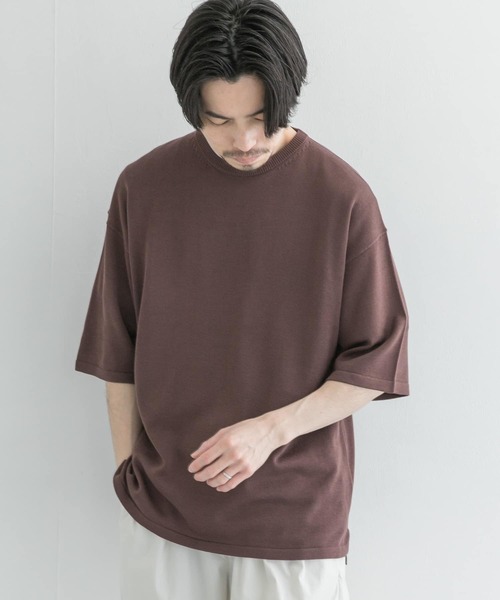 ■URBAN RESEARCH 2021SS 天竺編みによる柔らかく快適な着心地と、程よいルーズなシルエットが夏のトップスバリエーションを増やしてくれるニットTEE。 上品な質感と、肘まで落ちる袖丈がカットソーにはない余裕のあるフェイスに。CHARCOAL、TAUPE BEIGE、ROSE BROWNのシーズナルカラーを採用し、ウォッシャブル加工をより楽しんで頂けるカラバリ。 スラックスにレザーサンダルといったリゾートなスタイルも今期は押さえておきたい。 【体型別スタッフ着用レビュー】 ≪身長:165cm 体型:やせ型 着用サイズ:M≫ Mサイズで少しゆったりめのサイズ感です。 カジュアルすぎず、上品に着用できる一枚です。 袖はひじ辺りまでの長さです。 ≪身長:174cm 体型:普通 着用サイズ:L≫ 一見、暑いかなと思いましたが、軽い着心地で快適に着れました。Lサイズで大きすぎず程よくゆったりしていて、安心して着れるのも良い。 夏は単調な着こなしになりがちなので、こういったアイテムは助かります。 ≪身長:184cm 体型:やせ型 着用サイズ:L≫ ニット編みですが、サラりとした素材感で、生地も薄手で暑苦しさは感じられません。 一般的なTシャツとはまた違った大人っぽさが感じられます。 袖丈は肘で留まる5分袖、着丈はお尻の半分隠れる程度、肩はドロップしている為ゆったり目で、身幅や腰回りにもたっぷりとしたゆとりがあり、素材の柔らかさも相まってルーズな雰囲気を楽しめます。 ※商品画像は、光の当たり具合やパソコンなどの閲覧環境により、実際の色味と異なって見える場合がございます。予めご了承ください。 ※商品の色味の目安は、商品単体の画像をご参照ください。 ▼お気に入り登録のおすすめ▼ お気に入り登録商品は、マイページにて現在の価格情報や在庫状況の確認が可能です。 お買い物リストの管理に是非ご利用下さい。 ----------------------------- 透け感:ややあり 伸縮性:あり 裏地:なし 光沢:なし ポケット:なし -----------------------------