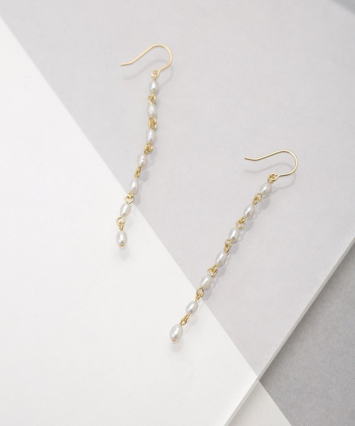 ■小粒のライスパールを繋いだ気品あるデザイン■ ランダムなライスパールを1粒1粒繋いだロングピアス。耳元で揺れ動くエレガントなデザイン。上品な大きさなのでフォーマルにもカジュアルにもマッチするひと品です。 ・ランダムなライスパールを繋げたロングピアス ・華奢なフォルムが上品 ・耳元で揺れ動くチェーンデザイン ・フック型 ・結婚式、二次会、お呼ばれ、パーティーにも◎ ◆nano・universe◆