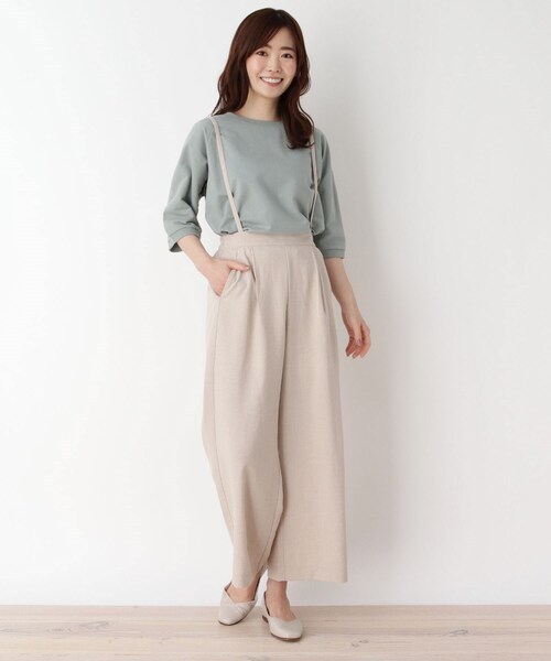 【デザイン】程よくキレイ目なカジュアル感のある麻ライクのパンツです。とりはずせるサスペンダーが付き大人のカジュアルスタイルにピッタリ。バックウエストゴムなので楽な穿き心地。トップスのボトムインもしやすいです。※ポケット数:前×2【生地感】肌にまとわりつかないサラッとしたリネン調の生地感です。ヒップまわりに裏地付きモデル情報:身長166cm B83 W58 H85 着用サイズ:38(M)店舗へのお問い合わせ商品番号:763-62214●製品寸法:38(M):W68cm H109cm 股下63cm 前股上30cm 渡り幅37cm 裾幅30cm40(L):W71cm H112cm 股下64cm 前股上31cm 渡り幅38cm 裾幅31cm42(LL):W74cm H115cm 股下65cm 前股上31cm 渡り幅39cm 裾幅32cm備考: