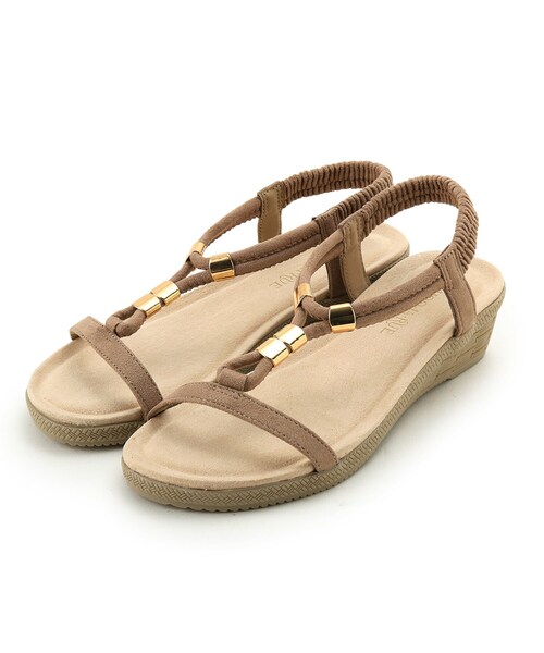 【デザイン】 しっかりとアンクルをホールドするTベルトデザインのサンダル。 ベルト部分を飾るメタルパーツが、ヌーディな足元にラグジュアリーな煌めきをプラスします。 かかと部分をシャーリングゴムで切り替えることで、優しい肌当たりと快適なフィット感を叶えます。 ふかふかのソールで長時間履いても疲れにくいのも◎ 店舗へのお問い合わせ商品番号:C70-12106 ●製品寸法: 25(22.5cm):対応サイズ22.5cm ヒール高4.5cm 幅8.3cm 35(23.5cm):対応サイズ23.5cm ヒール高4.5cm 幅8.5cm 45(24.5cm):対応サイズ24.5cm ヒール高4.5cm 幅8.7cm 備考:重量:45(24.5cm)片足約210g