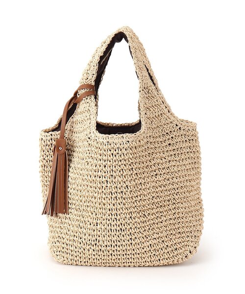 【デザイン】ペーパー素材をざっくりと編み上げたくり手トートバッグ。コーディネートを選らばないシンプルなデザインで、1点投入するだけで夏らしいスタイリングにシフトチェンジして頂けます。揺らめくタッセルがレディな表情をプラス。財布やスマホ、必要なアイテムはもちろん、ミニノートも収納可能です。※ポケット数:内側×2店舗へのお問い合わせ商品番号:F97-02034●製品寸法:00:高さ21cm 幅(上部)34cm 幅(下部)26cm マチ18.5cm 持ち手上がり18cm 付属チャーム全長23cm 付属チャームモチーフH12.5cm 付属チャームモチーフW2cm備考:重量:約245g