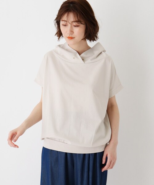 【デザイン】 程よくゆったりとしたシルエットで、抜け感のあるボリューム襟が今年らしいポイントのプルオーバー。 パーカー風デザインがチャーミングで、アクセントのハトメはゴールドにして上品さのある顔まわりに。 カジュアルさと上品さのバランス感がほどよくキレイめにも着て頂けます。 【生地感】 さらりとキレイな表面感、適度なコシのある中肉コットン(綿)ブレンド生地。カットソー、Tシャツのような風合い・厚みです。 モデル情報:身長165cm B80 W60 H86 着用サイズ:02(M) 店舗へのお問い合わせ商品番号:741-12349 ●製品寸法: 02(M):着丈56cm B118cm 裄丈36cm 03(L):着丈57cm B122cm 裄丈39cm 備考: