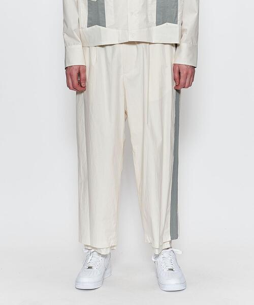 サイドをピンタック入りの別色の生地で切り替えたパンツ。さっぱりとした風合いのコットンクロスと、裾から覗くカットオフ始末の別生地とのコントラストも目を引く1点です。ゆったりとしたワイドなシルエットで、綺麗な立体感を構築。<FACCIES>2017年AWスタートの日本のニットブランド。シーズンテーマは特に設けておらず、リアルクローズとして着る事のできる服を前提にコレクションを製作しています。店舗へお問い合わせの際は、全国のBEAUTY & YOUTH各店舗まで下記の品名/品番をお申し付け下さい。品名:FACCIES CUBA PT 品番:8314-599-1251
