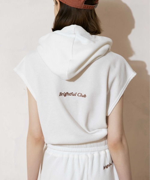 バックの配色ロゴ刺繍がポイントのワッフルノースリフーディー 柔らかな肌触りと、凹凸感のある表面感がかわいいワッフルカットソーを使用した、ノースリーブフーディー。 トレンドのリラックスムードが楽しめるアイテムです。 【styling】 同素材のバックロゴ刺繍入りワッフルリラックスパンツ(20022113100618)とのセットアップ着用がオススメです。 F:着丈53cm 肩幅52cm バスト96cm