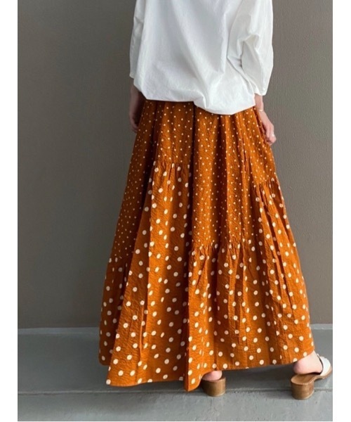 サイズの異なるドット生地をパッチワークにしたギャザースカートです。表面がポコポコしたシアサッカー生地で肌への接触面が少なく、暑い時期にもさらりと着ていただけます。ウエストギャザーでラクなデザイン。切り替えが入っているため見える場所によって表情が違い、部分的にトレンドのティアードスカートの様にも見えます。 【スタッフコメント】 DAZAI 青山 166cm 【shirt】着用サイズ:F 大きさの違うドットがパッチワークされたギャザースカート。 裏地も付いているので透け感もなく、ウエストがゴムで紐が付いているので調節しやすいです。 洗濯 :手洗い可 伸縮性:なし 透け感:なし 裏地 :あり 光沢感:なし 【アテンション】 取り扱いについては商品についている品質表示でご確認ください。 ※商品の色味は撮影場所や光の当たり具合によって違って見える場合がございます。 またお客様ご使用のパソコンモニター環境などによって違って見える場合がございますので 予めご了承の上ご注文ください。 Bottom 【商品をお気に入り登録しておきましょう!】 気になるアイテムは、♡マークをクリックしておくことで、スムーズにお買い物が楽しめます。 ・ラスト一点のお知らせ ・再入荷のお知らせ ・予約商品が店頭に入る際にお知らせ ・SALEのご案内 ※写真はサンプルを撮影しています。実際の商品は仕様が異なる場合がございますので、ご了承下さいませ。