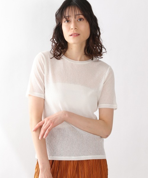 少しコンパクトなサイズ感にしたカットソー。素材にシアー感があり涼し気な印象を与えるので、あえて首元はつまり気味にして今年らしさを出しています。ポリエステル100%なのでシャリ味があり、さらっとした風合いが特徴になります。様々なアイテムと相性の良い1枚。コンパクトなサイズ感なのでボリュームのあるボトムスとの合わせも◎。サロペットやキャミワンピースのインナーとしてもおすすめです。