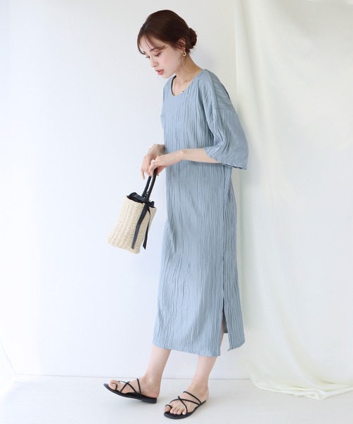 上品な軽くて柔らかい素材に、細めのプリーツが女性らしい印象の半袖ミニプリーツワンピースつやっと光沢感のあるテロンとした素材のロングワンピース。裾にはスリットで動きやすく、シンプルなのに一枚で上品かつおしゃれに見えるデザイン性のあるワンピースに仕上げました。春夏は1枚でさらりと着ると◎ゆったりと着こなしやすいラウンドネックに縦のプリーツラインで着やせ効果も◎カットソーワンピのようにリラックスして着られるので、リゾートやおうちファッションにもぴったり。程よく身体にフィットするデザインでボトムを選ばず、カジュアルからキレイめなスタイルまで幅広いコーディネートに活躍するアイテムです。ライトカラーは透ける可能性がございますので、スキントーンのインナーの着用をおすすめします。[ コーディネート ]キャンバスバックを合わせてワンマイルのお出かけに◎夏にはサンダルと合わせて爽やかに。2WAY ポケットキャンバストートバッグ 55951456(ZOZO)542119-1737(店舗)2WAYシンプルストラップサンダル 53757253(ZOZO)542019-8802(店舗)ふかふか2WAYストラップフラットサンダル 57251274(ZOZO)542119-1769(店舗)ミニトートかごバッグ 57403082(ZOZO)542119-1775(店舗)【テレワーク映え・おうち服】・在宅ワーク/リモートワーク/テレワークでも活躍・リモート飲み会にも◎・ちょっとしたお出かけのワンマイルウェアに[ 商品のお気に入り登録 ]完売カラーの再入荷通知や、値下げのお知らせ、ラスト1点の通知などが受け取ることができます。随時再入荷していますので、お気に入り登録して頂くと再入荷情報がGET出来ます。[ ブランドのお気に入り登録 ]新商品の発売や再入荷、タイムセールやクーポン発行のお知らせなどBLUEEASTのお得な情報を受け取ることができます。ぜひご登録ください♪※撮影環境により、モデル着用画像は実際の商品と色味が異なって見える場合がございます。また、PCやスマートフォンの環境により画面上と実物では多少色が異なって見える場合がございます。トルソー画像が実際の商品に一番近いお色となりますのでご確認ください。