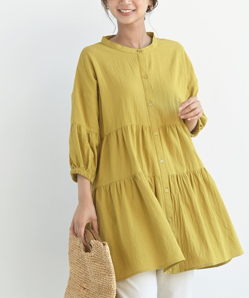 人気のティアードブラウスに6分袖が登場♪コットンクレープの素材が爽やかで清潔感のある装いに仕上げてくれるブラウスチュニックが爽やかな6分袖で登場。ふんわりと広がるティアードシルエットで体のラインを拾わずリラクシーにご着用いただけるアイテムです。ギャザーたっぷりの切替がガーリーな雰囲気に。袖口もふっくらと仕上げて女性らしい手元を演出してくれます。半端丈の袖は手元の華奢見えも◎。襟元はバンドカラーで装いを上品に仕上げてくれます。スタイリングが明るくなるパステルカラーも魅力♪※長袖タイプはこちら 【0830100538】 バンドカラーティアード前開きブラウス裏地なし伸縮性なし薄手前開きボタン留め袖口ゴム仕様織キズやしわ等は生地の特質です洗濯:手洗い可