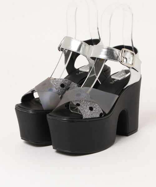 SUNNY ROOM SELECTION ボリューム感がトレンドにマッチする厚底サンダル。 甲のクロスベルトは片側がクリア素材になって『抜け感』を演出。 ボリュームあるブラック厚底ソールは11cmのヒールながら ストーム(前部分)6cmと高低差は少なく、見た目のわりに歩きやすくなっています。人気のチャンキーヒール(太ヒール)で安定感も◎ 【カラー展開】 どんなコーデにも合わせやすい、ブラック♪ 足元に目を引く、落ち着いたべっ甲柄のブラウン♪ ドット柄でフェミニンコーデにも、シルバー♪
