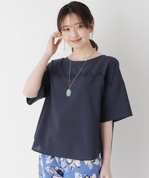 【デザイン】 胸元のスカラップしたエンブロイダリーデザインが可愛らしいブラウス。 着まわし力がありつつも、華やかさを兼ね備えたアイテムです。 セットアップスタイルはもちろん、マニッシュなワイドパンツや女性らしいスカートにもぴったり。 【生地感】 ドライタッチで清涼感ある肌触りに仕上げた、麻のような風合いのポリエステル素材です。 麻調合繊だからこそシワになりにくいイージーケアが魅力。 こちらの商品はセットアップでご利用いただけます。 パンツ:検索番号606-62018 こちらの商品は主に夏に着用いただける商品です。 モデル情報:身長162cm B78 W60 H85 着用サイズ:F 店舗へのお問い合わせ商品番号:606-82012 ●製品寸法: F:着丈62cm B113cm 袖丈19cm 肩幅61cm 備考: