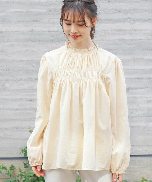 シャーリング加工がポイントのブラウス。 ハイネックデザインですっきりと大人っぽく着られます。 シンプルながらも程よくゆとりのあるシルエットで抜け感のある1枚。 ワンピースやスカートと合わせてクラシカルなスタイリングはもちろん、パンツでカジュアルにも◎ ニットや羽織りとのレイヤードスタイルもおすすめです。 首元のフリルが女性らしさを演出してくれます。 袖口にはシャーリングゴムを施し、袖をまくり上げた着こなしも◎ さらっとした肌触りのコットン100%。 柔らかくストレスフリーな着心地です。 - - - - - - - - - - - - - - - - - - - - - - - - - - - - - - - - - 透け感:ややあり 裏地:なし 伸縮性:なし 光沢感:なし - - - - - - - - - - - - - - - - - - - - - - - - - - - - - - - - -
