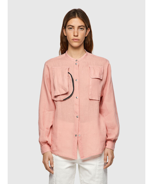 リネン素材が季節感を感じさせてくれるノーカラーシャツ。体のラインを拾わないボクシーフィットのルーズなシルエットが特徴的。フロントのラウンドジップポケットやベルクロディテールがDIESELらしいユニークなデザインです。ショートパンツやスカートといったフェミニンなボトムスとも相性バツグン!キャッチーなカラーリングで気分を上げてくれる、涼し気な長袖リネンシャツです。