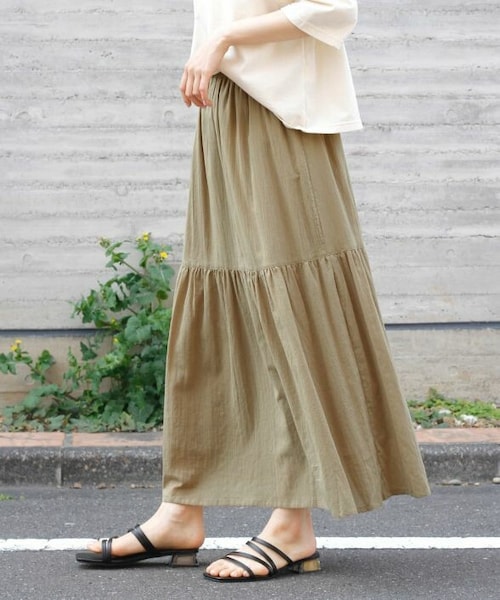 トレンドライクな雰囲気漂うティアードスカート。 歩く度にふわっと揺れるシルエットは、フェミニンな女性らしさを演出してくれます。 ウエスト部分のフリルもさり気ないポイントに。 ブラウスと合わせたきれいめスタイルはもちろん、 丈の長いトップスとのルーズな着こなしもこなれ感がありおすすめです。 楊柳生地を使用し、女性らしいシルエットながらもリラックス感をプラス◎ ウエストはゴム仕様で快適な履き心地が叶います。 肌当たりの良いコットン100%。 清涼感があり、これからの暑い時期にも活躍のアイテムです。 - - - - - - - - - - - - - - - - - - - - - - - - - - - - - - - - - 透け感:なし(ホワイトのみややあり) 裏地:あり 伸縮性:ややあり 光沢感:なし - - - - - - - - - - - - - - - - - - - - - - - - - - - - - - - - -