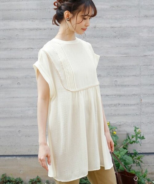バイカラーのパイピングがポイントのチュニック。 全体に施したギャザーが程よいボリュームを出してくれます。 フロントのタックが顔周りを華やかな印象に。 大きめに開いたバックデザインが後ろ姿も抜かりなく演出してくれます。 オンオフ問わず使用できる着回しやすいアイテムです。 サイドスリット入りで抜け感をプラスしてくれます。 フレンチスリーブで腕周りをすっきりとした印象に。 透け感がありさらっとした肌触りです。 凹凸があるので肌に張り付きにくいのも嬉しいポイント◎ - - - - - - - - - - - - - - - - - - - - - - - - - - - - - - - - - 透け感:あり 裏地:なし 伸縮性:なし 光沢感:なし - - - - - - - - - - - - - - - - - - - - - - - - - - - - - - - - -