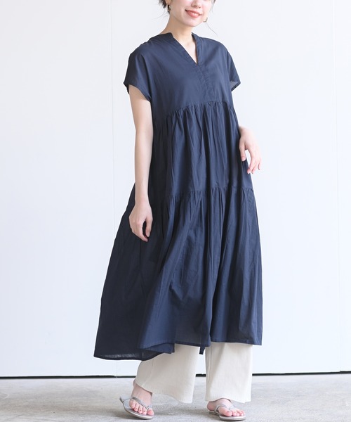 ふんわり涼しげなティアードワンピース ふわっと広がるトレンドのティアードワンピース。 さらっとしたコットン素材が爽やかでシーズンライクな装いが楽しめます。 ボリューム感のあるシルエットもスキッパー衿ですっきりと。 ノーカラーなので上品な印象に仕上がります。 ウエストの切替部分から裏地がついていますが、ガーゼのようなコットン素材なので汗ばむ季節も快適に。 ワンピースとして1枚でももちろん、パンツやレギンスを合わせれば大人っぽく着られます。 ウエストから下裏地あり 伸縮性なし 薄手 インド生産 (インド製品特有の色柄、風合いのため多少の色むら、織りキズ等は商品の特徴の一つですので、予めご了承ください) 洗濯:洗濯機使用可(ネット使用)