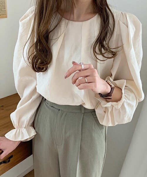 キャンディスリーブの袖がポイント。 つるんとした柔らかい生地で大人めコーデにぴったりなブラウス。 ボリュームのあるパワショルデザインですが胸元にはタックが入っておりすっきり見えます◎