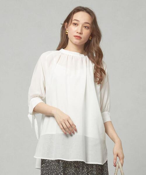 柔らかな風合いのコットンボイル素材が、シーズンライクな着こなしを叶えるチュニックブラウス。シアーな風合いにゆったりとしたリラックス感のあるオーバーサイズが旬な表情を魅せる一枚。さりげないハイネックに細かくギャザーを施したフェミニンな襟元やサイドスリットが抜け感をつくり、程よくカジュアルダウンされたルックスに仕上げています。袖にリボンやバックボタンが着こなしにアクセントを添え、シンプルなボトムと合わせても他と差がつくアイテムです。柄パンツやレギンスを合わせたリゾートスタイルから、タイトスカートやマキシスカートを合わせた女性らしい着こなしまで幅広く楽しめます。____________________透け感:ややあり生地の伸び:なし裏地:なしケア方法:洗濯機洗い可____________________<closet story>フレンチシックとブリットモダンがテーマのオリジナル企画レーベル。若々しさと可愛らしさをもったエレガントなスタイルをベースに、都会的で今日を生きる女性が「自分らしさ」を大切にしたいときに揃えたいアイテムを提案します。店舗へお問い合わせの際は、全国のTHE STATION STORE各店舗まで下記の品番をお申し付け下さい。品番:6916-699-0382