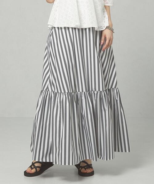 綿糸をブレンドしたハリのある素材のマキシ丈スカート。ウエスト周りはすっきりと、裾にかけて緩やかに広がるシルエットにティアードデザインが、女性らしさを後押しするトレンドライクな一枚。白地の爽やかなストライプが、ダークカラーのトップスを合わせても夏らしいスタイリングが叶い、カラーで遊んだり、シンプルにTシャツと合わせてもサマになるアイテムです。◇同デザインのブラック無地(品番:6924-599-0535)をご用意しています。<ma couleur(マ クルール)>2020autumn/winterよりスタート。情報過多な現代の女性達に向けた、日々を楽しむための強さと華やかさを兼ね備えたブランドです。店舗へお問い合わせの際は、全国のTHE STATION STORE各店舗まで下記の品番をお申し付け下さい。品番:6924-599-0536