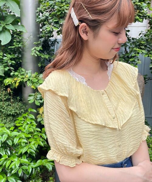 <POINT>大ぶりの襟が可愛いトレンド感満載のブラウスが登場♪柔らかい透け感のあるブラウスなのでキャミソールで合わせると可愛いです◎袖もゴムが入っていてぷっくりボリュームが出るのでガーリーな印象で着用も出来ます☆<STYLE>合わせやすいデザイントップスなので、デニムでヘルシーな印象で着用したりフレアの揺れ感の出るスカートで合わせるのもおすすめです♪