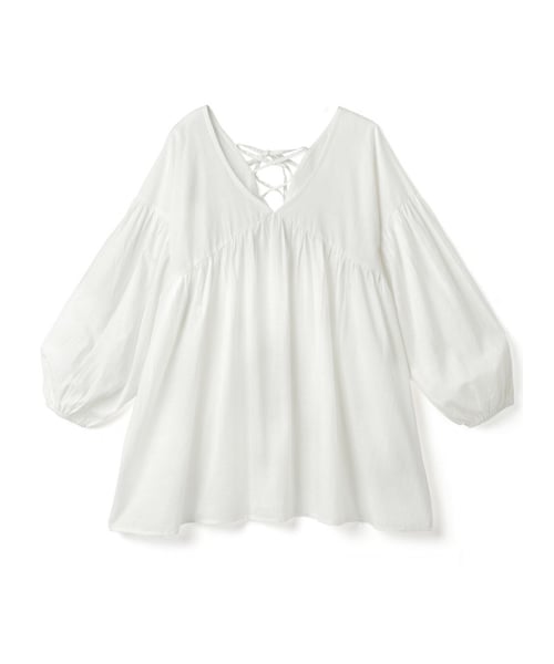 すっきりと開いたVネックが、デコルテを綺麗に見せてくれる。 バックリボンが後ろ姿まで可愛く演出する。 胸元の切替からふんわり広がるAラインシルエットがフェミニンな印象に◎ 長めのチュニック丈がさりげなく体型カバーしてくれる。
